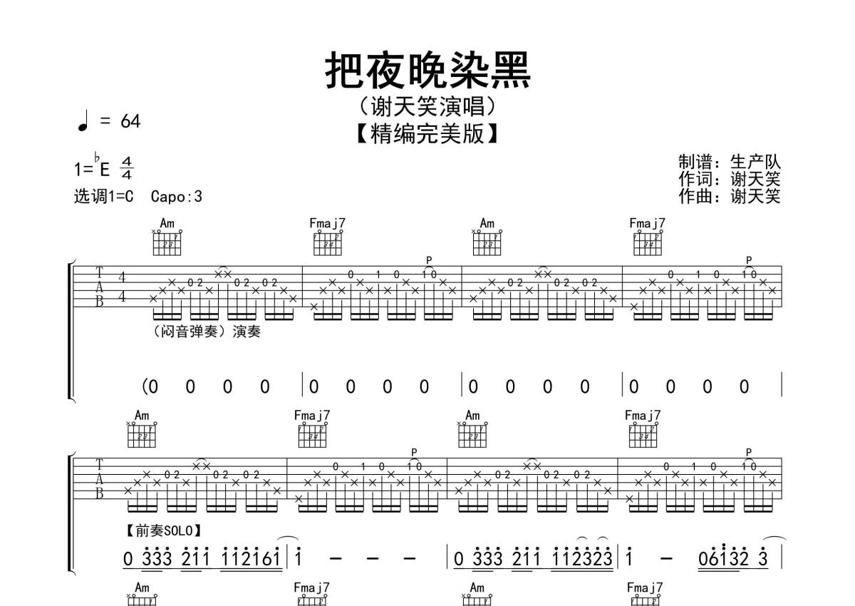 《把夜晚染黑》是谢天笑演唱的一首歌曲,精编完美版,拍号为4/4拍,歌曲速度为每分钟64拍,歌曲原调为Eb调,但由于原调指法比较难,为了方便弹奏,本吉他谱采用的是C调指法编配,变调夹3品弹奏即为原调,当然也可以根据自己的音域改变变调夹位置,或者通过改变和弦调性,以方便自己弹奏,这份吉他谱共有三张高清图谱,图谱由 @生产队 编配上传,图谱使用六线谱编配,包含吉他和弦指法、简谱以及歌词部分,使用这份把夜晚染黑吉他谱,可以让你更加方便地掌握这首歌曲的弹唱技巧,快来尝试吧。《把夜晚染黑》是有谢天笑作词、作曲并演唱的摇滚歌曲。本吉他谱根据原版采用C调指法编配,精准的前奏、间奏、尾奏和SOLO编配,非常好听的riff连复段值得推荐!。