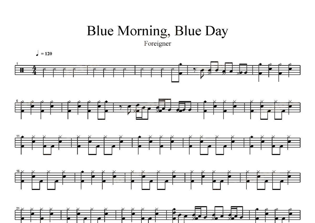 《Blue Morning, Blue Day》是Foreigner演唱的一首歌曲,这份鼓谱共有三张高清图谱,图谱由 @打鼓谱 编配上传,图谱使用五线谱编配,使用这份Blue Morning, Blue Day架子鼓谱,你将能够轻松地敲打出这首Foreigner的Blue Morning, Blue Day,快来尝试吧。首张收录专辑: Double Vision 发行时间: 1978 年 流派: 摇滚 。