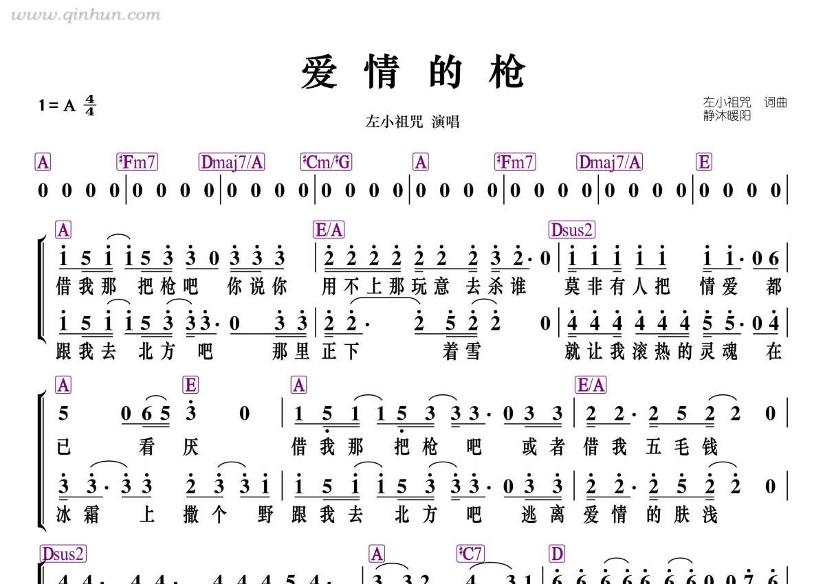 《爱情的枪》是左小祖咒演唱的一首歌曲,带和弦级数,这份简谱共有两张高清图谱,图谱由 @静沐暖阳 编配上传。