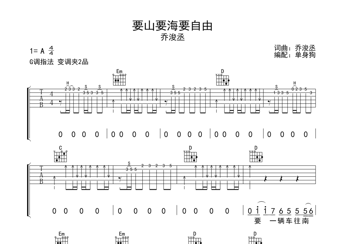 《要山要海要自由》是乔浚丞演唱的一首歌曲,拍号为4/4拍,歌曲原调为A调,但由于原调指法比较难,为了方便弹奏,本吉他谱采用的是G调指法编配,变调夹2品弹奏即为原调,当然也可以根据自己的音域改变变调夹位置,或者通过改变和弦调性,以方便自己弹奏,这份吉他谱共有三张高清图谱,图谱由 @单身狗 编配上传,图谱使用六线谱编配,包含吉他和弦指法、简谱以及歌词部分,使用这份要山要海要自由吉他谱,可以让你更加方便地掌握这首歌曲的弹唱技巧,快来尝试吧。