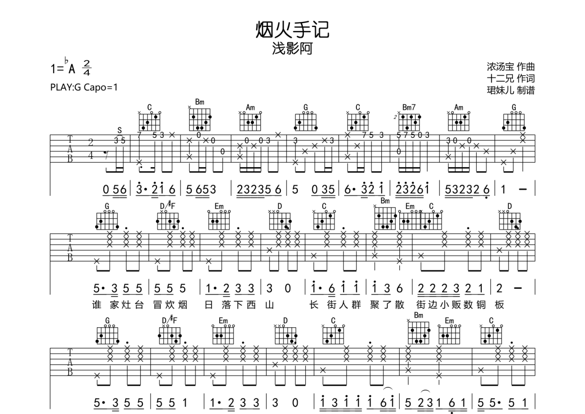浅影阿《烟火手记》吉他谱 - G调弹唱六线谱