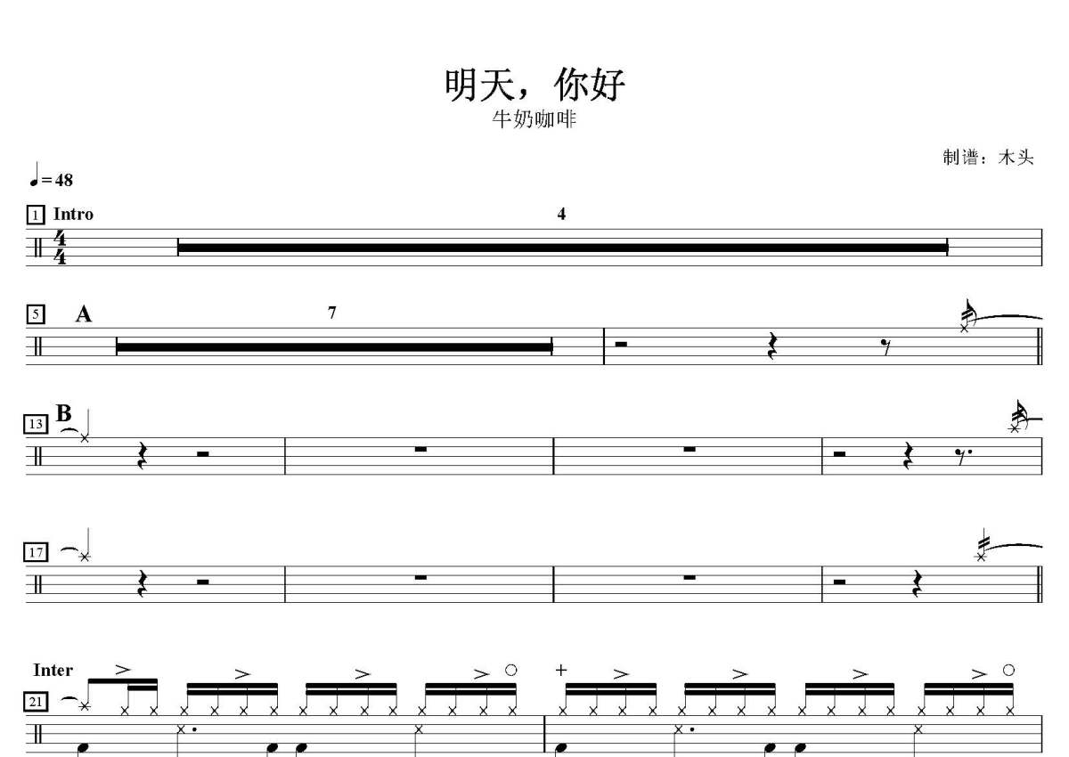 牛奶咖啡《明天,你好》鼓谱 - 架子鼓谱