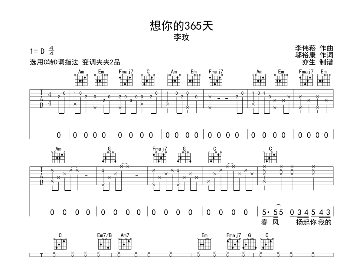 《想你的365天》是李玟演唱的一首歌曲,歌曲速度为每分钟75拍,歌曲原调为D调,但由于原调指法比较难,为了方便弹奏,本吉他谱采用的是C调指法编配,变调夹2品弹奏即为原调,当然也可以根据自己的音域改变变调夹位置,或者通过改变和弦调性,以方便自己弹奏,这份吉他谱共有三张高清图谱,图谱由 @亦生 编配上传,图谱使用六线谱编配,包含吉他和弦指法、简谱以及歌词部分,使用这份想你的365天吉他谱,可以让你更加方便地掌握这首歌曲的弹唱技巧,快来尝试吧。演奏难度为简单。
