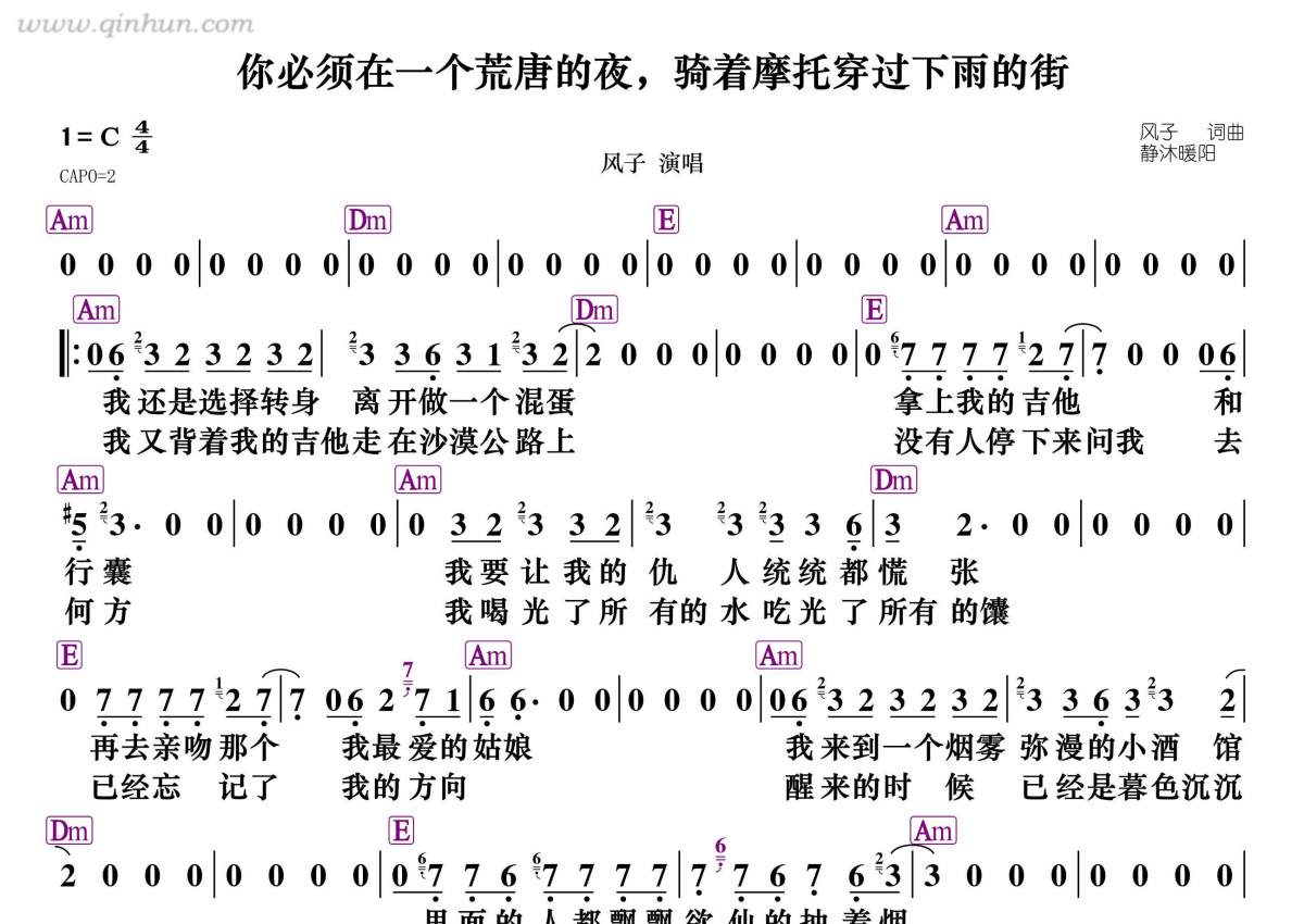 风子《你必须在一个荒唐的夜,骑着摩托穿过下雨的街》简谱 - 带和弦级数