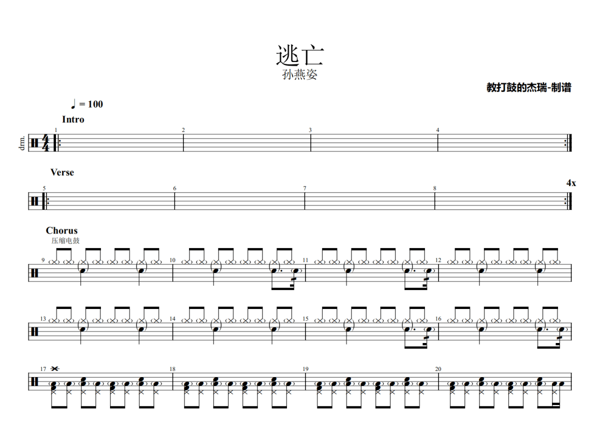 孙燕姿《逃亡》鼓谱 - 架子鼓谱