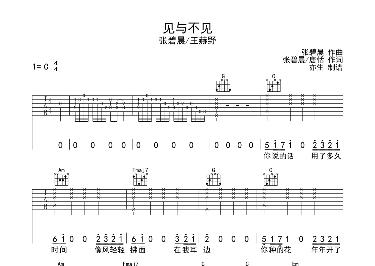 《见与不见》是张碧晨演唱的一首歌曲,拍号为4/4拍,歌曲原调为C调,本吉他谱采用的是C调指法编配,演奏时不需要使用变调夹即为原调,这份吉他谱共有三张高清图谱,图谱由 @亦生 编配上传,图谱使用六线谱编配,包含吉他和弦指法、简谱以及歌词部分,使用这份见与不见吉他谱,可以让你更加方便地掌握这首歌曲的弹唱技巧,快来尝试吧。见与不见吉他弹唱谱,本吉他谱采用C调和弦编配,演奏速度大概60拍每分钟,难度简单。