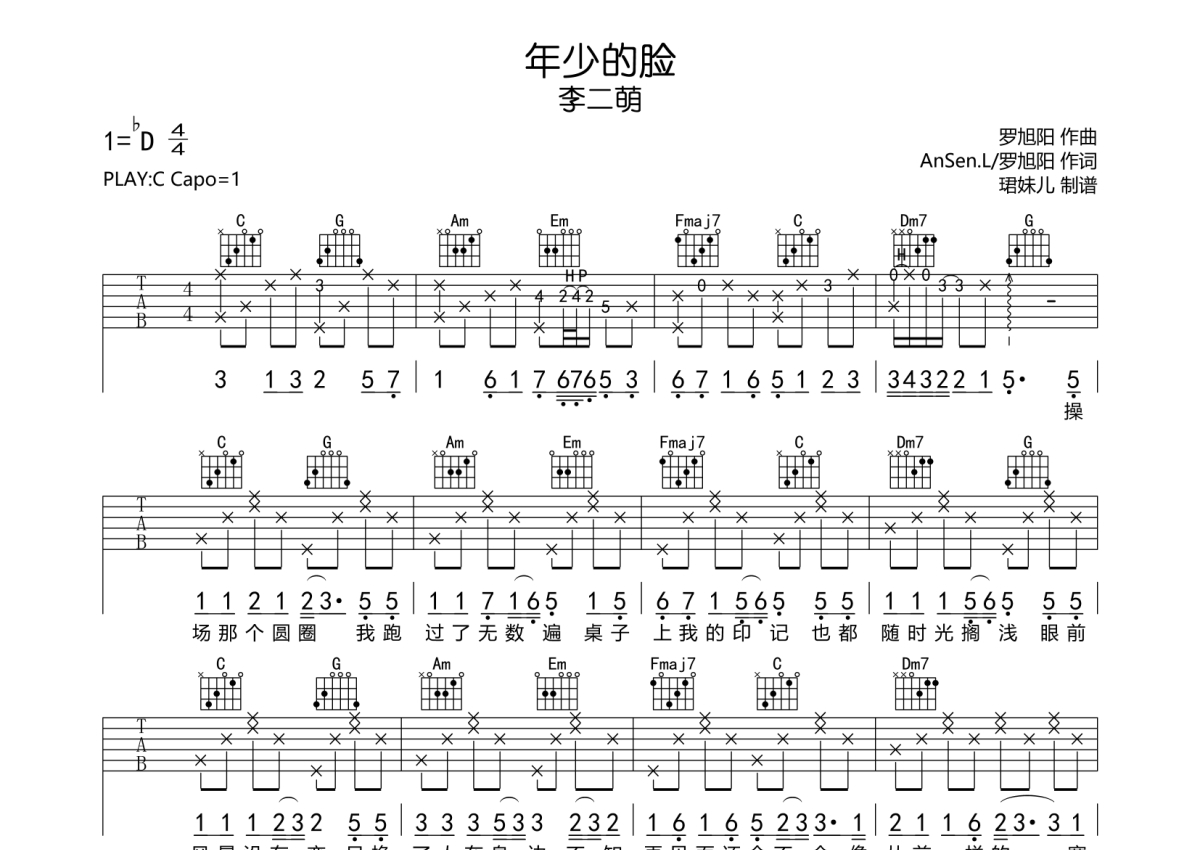 《年少的脸》是李二萌演唱的一首歌曲,拍号为4/4拍,歌曲速度为每分钟70拍,歌曲原调为Db调,但由于原调指法比较难,为了方便弹奏,本吉他谱采用的是C调指法编配,变调夹1品弹奏即为原调,当然也可以根据自己的音域改变变调夹位置,或者通过改变和弦调性,以方便自己弹奏,这份吉他谱共有两张高清图谱,图谱由 @珺妹儿 编配上传,图谱使用六线谱编配,包含吉他和弦指法、简谱以及歌词部分,使用这份年少的脸吉他谱,可以让你更加方便地掌握这首歌曲的弹唱技巧,快来尝试吧。C调指法编配,弹唱建议变调夹1品,速度70难度较简单,易上手。