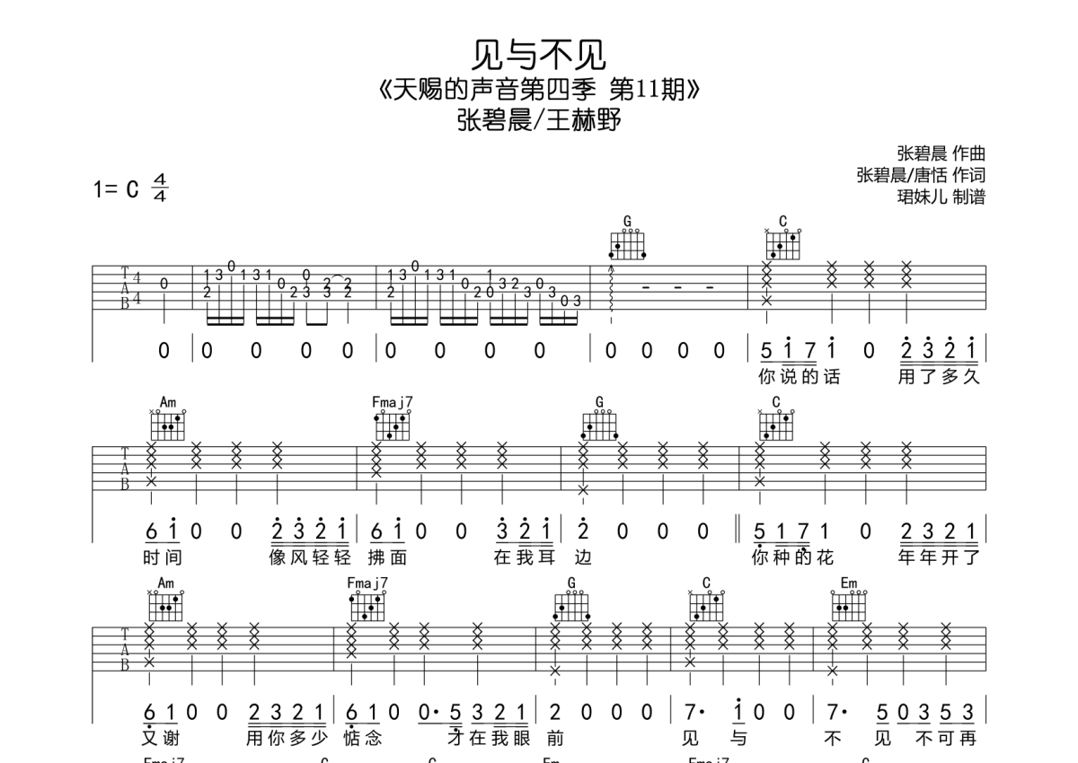 张碧晨/王赫野《见与不见》吉他谱 - C调弹唱六线谱