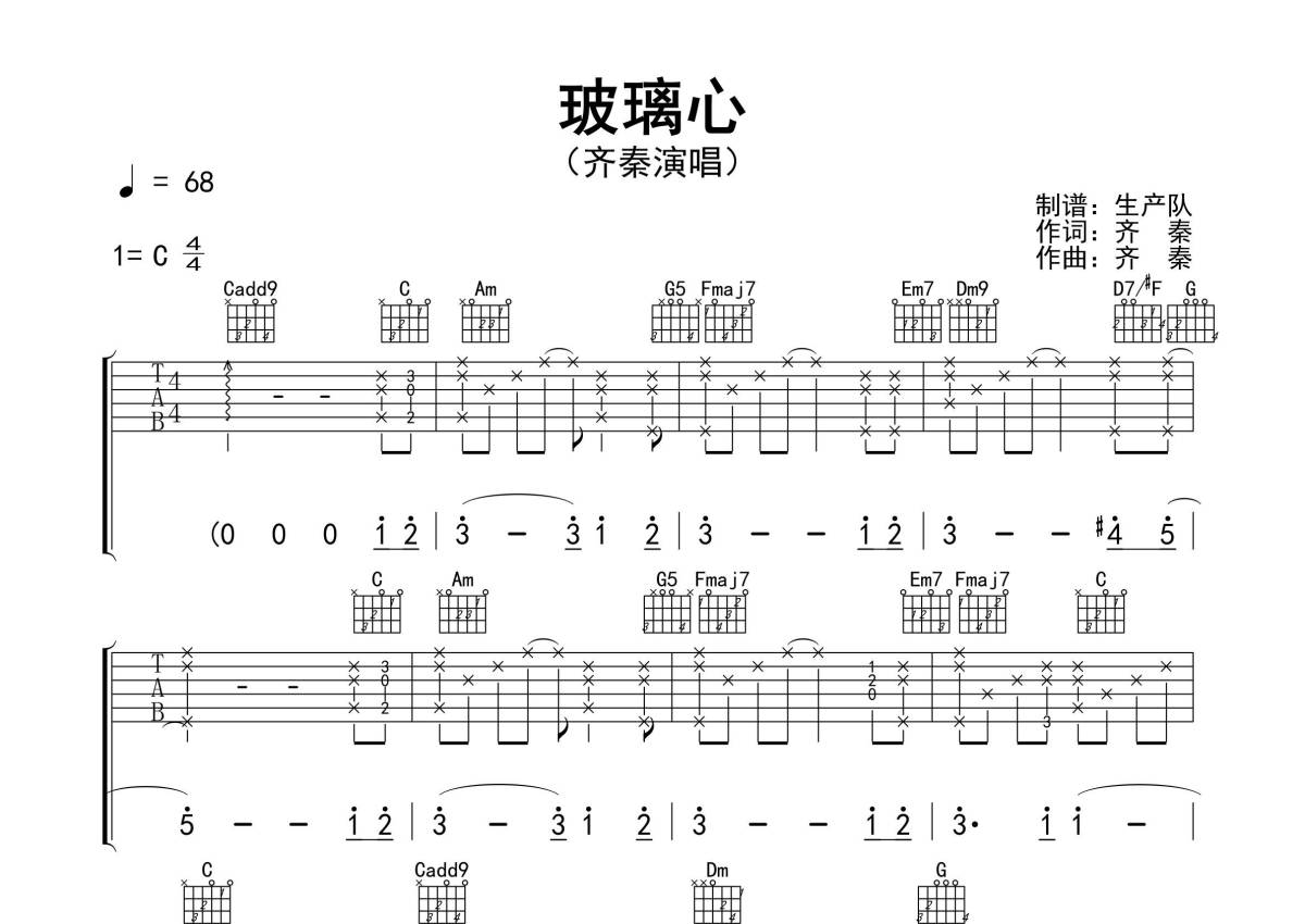 《玻璃心》是齐秦演唱的一首歌曲,精编民谣版,拍号为4/4拍,歌曲速度为每分钟68拍,歌曲原调为C调,本吉他谱采用的是C调指法编配,演奏时不需要使用变调夹即为原调,这份吉他谱共有三张高清图谱,图谱由 @生产队 编配上传,图谱使用六线谱编配,包含吉他和弦指法、简谱以及歌词部分,使用这份玻璃心吉他谱,可以让你更加方便地掌握这首歌曲的弹唱技巧,快来尝试吧。《玻璃心》是由齐秦于1991年作词作曲并演唱的一首歌,收录在专辑《柔情主义》中。本吉他谱根据原版C调指法编配,为了更加适合吉他弹唱的特点,对个别地方进行了优化处理,效果不错,值得推荐的的经典歌曲!。