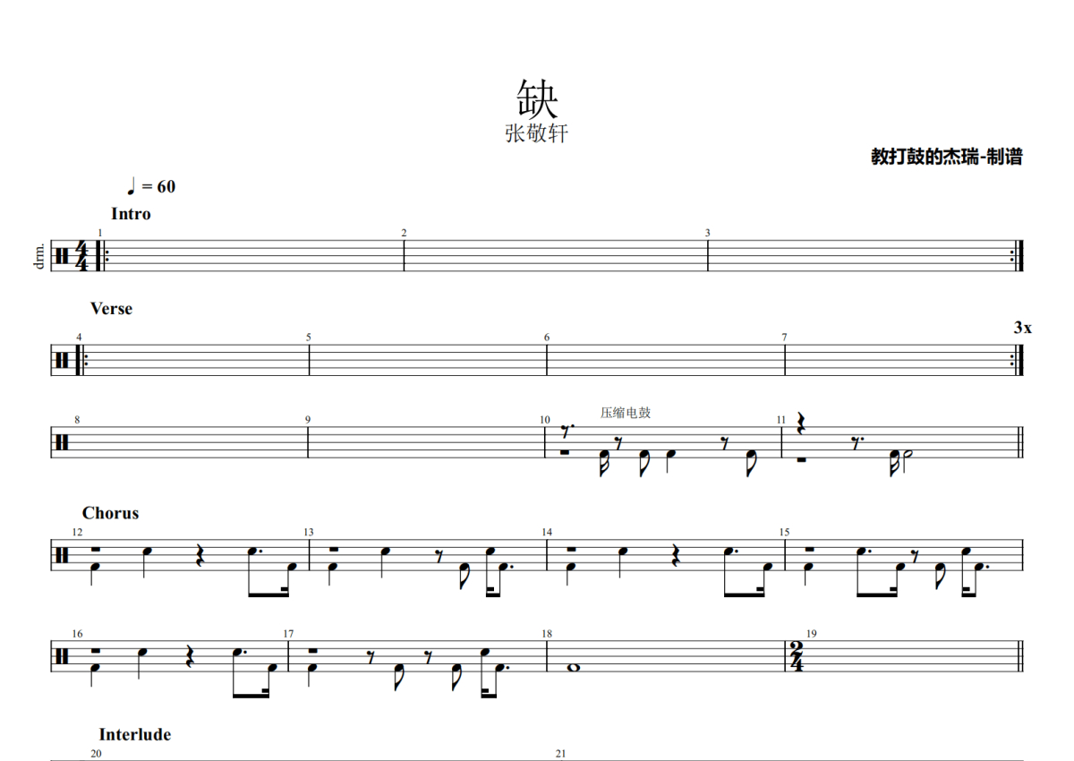 《缺》是张敬轩演唱的一首歌曲,拍号为4/4拍,歌曲速度为每分钟60拍,这份鼓谱共有两张高清图谱,图谱由 @Jerry 编配上传,图谱使用五线谱编配,使用这份缺架子鼓谱,你将能够轻松地敲打出这首张敬轩的缺,快来尝试吧。
