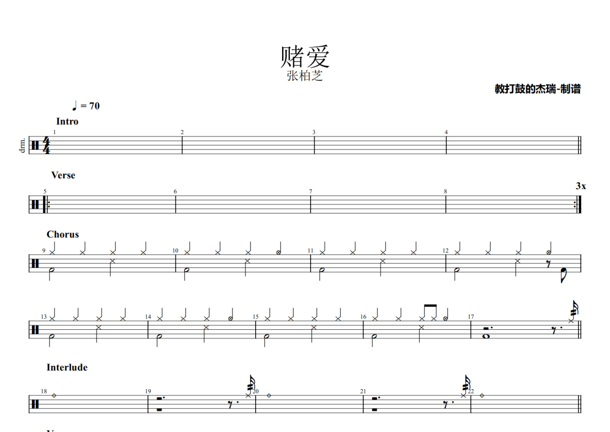 《赌爱》是张柏芝演唱的一首歌曲,拍号为4/4拍,歌曲速度为每分钟70拍,这份鼓谱共有两张高清图谱,图谱由 @Jerry 编配上传,图谱使用五线谱编配,使用这份赌爱架子鼓谱,你将能够轻松地敲打出这首张柏芝的赌爱,快来尝试吧。