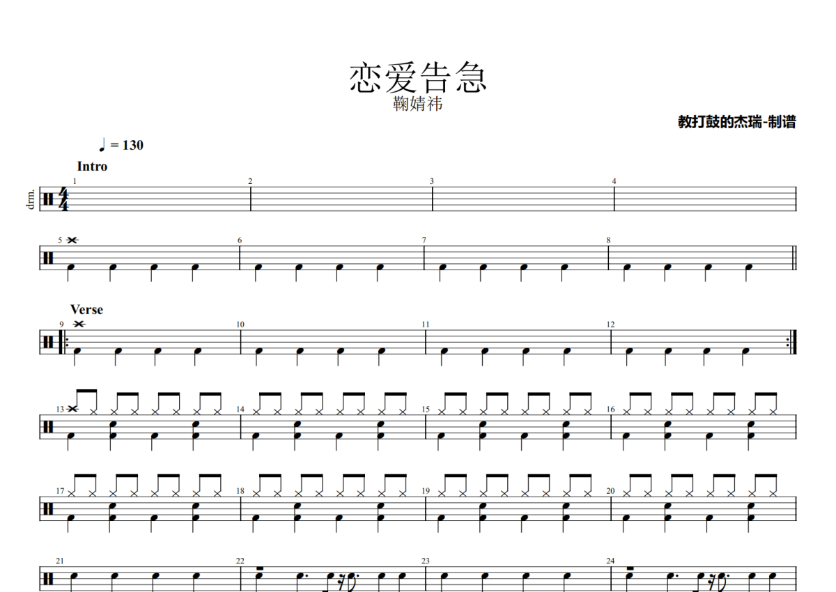 《恋爱告急》是鞠婧祎演唱的一首歌曲,拍号为4/4拍,歌曲速度为每分钟130拍,这份鼓谱共有两张高清图谱,图谱由 @Jerry 编配上传,图谱使用五线谱编配,使用这份恋爱告急架子鼓谱,你将能够轻松地敲打出这首鞠婧祎的恋爱告急,快来尝试吧。