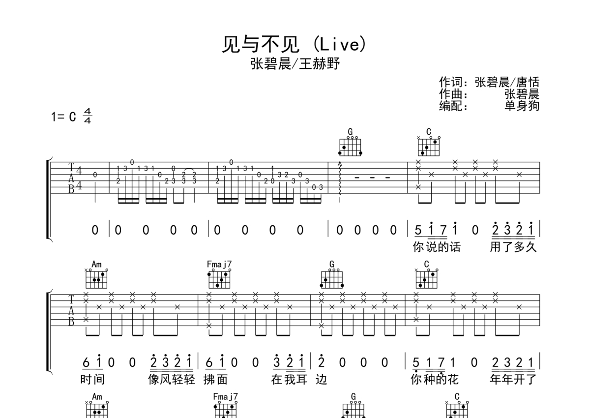 张碧晨/王赫野《见与不见》吉他谱 - C调弹唱六线谱