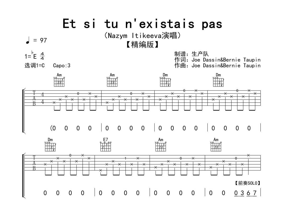 《Et si tu n'existais pas》是Nazym Itikeeva演唱的一首歌曲,精编版,歌曲速度为每分钟97拍,歌曲原调为Eb调,但由于原调指法比较难,为了方便弹奏,本吉他谱采用的是C调指法编配,变调夹3品弹奏即为原调,当然也可以根据自己的音域改变变调夹位置,或者通过改变和弦调性,以方便自己弹奏,这份吉他谱共有三张高清图谱,图谱由 @生产队 编配上传,图谱使用六线谱编配,包含吉他和弦指法、简谱以及歌词部分,使用这份Et si tu n'existais pas吉他谱,可以让你更加方便地掌握这首歌曲的弹唱技巧,快来尝试吧。《Et si tu n'existais pas》是Nazym Itikeeva演唱的歌曲,收录于《Made In Kz》专辑中。本吉他谱根据原版采用C调指法编配,精编版,和弦外音的应用是本曲的亮点,非常好听的歌曲,简约的不简单。值得推荐的欧美金曲!。
