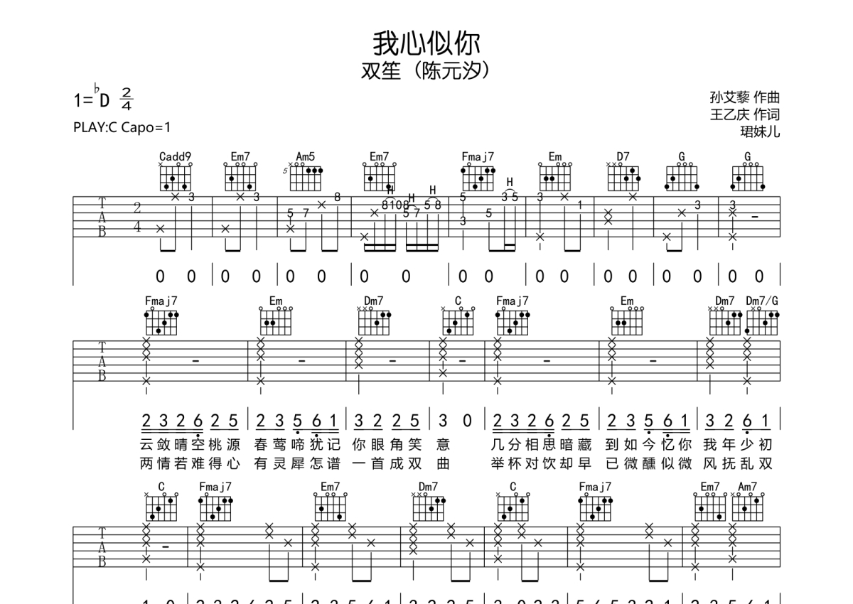 双笙 (陈元汐)《我心似你》吉他谱 - C调弹唱六线谱