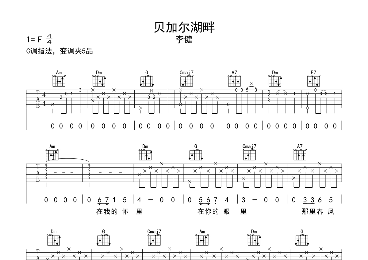 李健《贝加尔湖畔》吉他谱 - C调弹唱六线谱