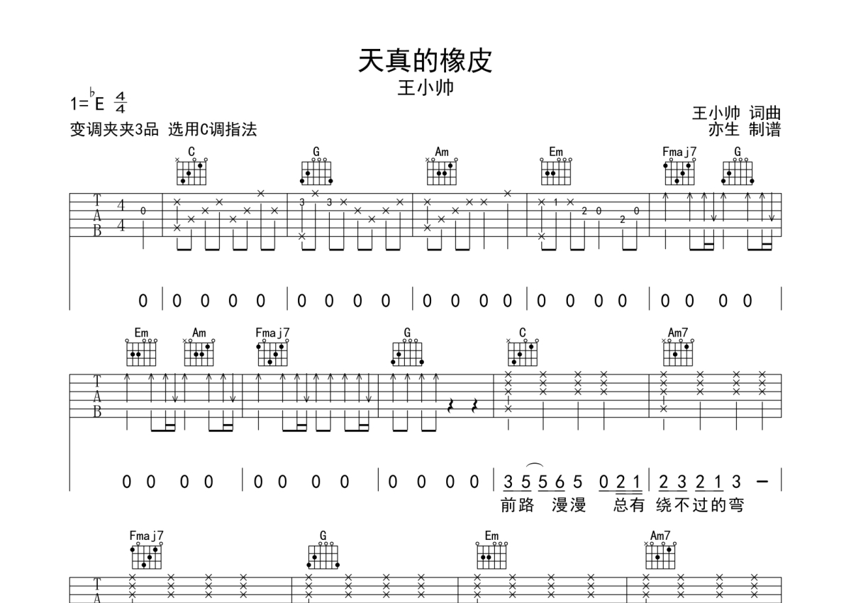 《天真的橡皮》是王小帅演唱的一首歌曲,拍号为4/4拍,歌曲速度为每分钟70拍,歌曲原调为Eb调,但由于原调指法比较难,为了方便弹奏,本吉他谱采用的是C调指法编配,变调夹3品弹奏即为原调,当然也可以根据自己的音域改变变调夹位置,或者通过改变和弦调性,以方便自己弹奏,这份吉他谱共有三张高清图谱,图谱由 @亦生 编配上传,图谱使用六线谱编配,包含吉他和弦指法、简谱以及歌词部分,使用这份天真的橡皮吉他谱,可以让你更加方便地掌握这首歌曲的弹唱技巧,快来尝试吧。整体难度简单。