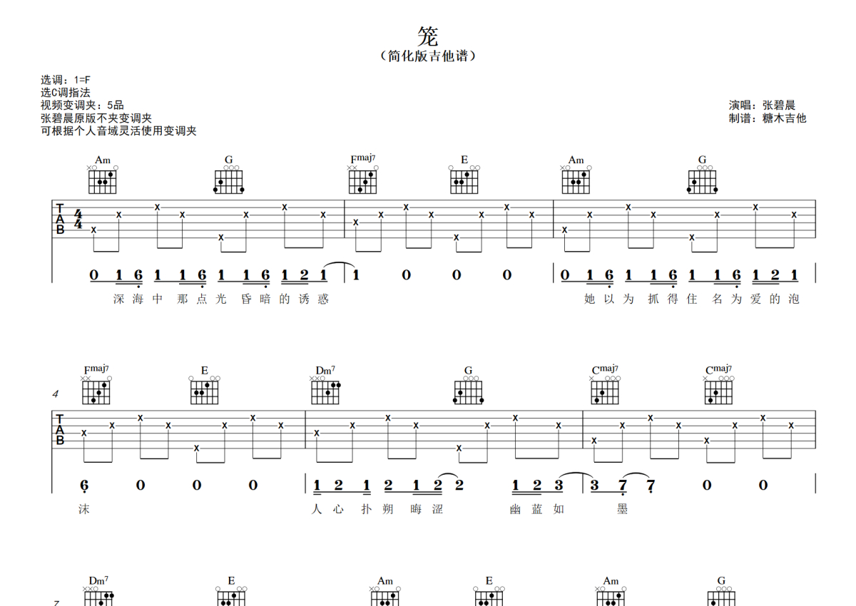 《笼》是张碧晨演唱的一首歌曲,分解版,拍号为4/4拍,歌曲原调为F调,但由于原调指法比较难,为了方便弹奏,本吉他谱采用的是C调指法编配,变调夹5品弹奏即为原调,当然也可以根据自己的音域改变变调夹位置,或者通过改变和弦调性,以方便自己弹奏,这份吉他谱共有三张高清图谱,图谱由 @糖木吉他 编配上传,图谱使用六线谱编配,包含吉他和弦指法、简谱以及歌词部分,使用这份笼吉他谱,可以让你更加方便地掌握这首歌曲的弹唱技巧,快来尝试吧。对新手超友好的简单吉他弹唱谱《笼》 张碧晨C调指法版 曲谱对应视频示范以及音频示范都可在抖音或者小红书搜索(糖木吉他)观看 想要更多吉他谱,可在抖音和小红书搜索关注“糖木吉他” 获取更多简单弹唱的吉他谱和弹唱视频。