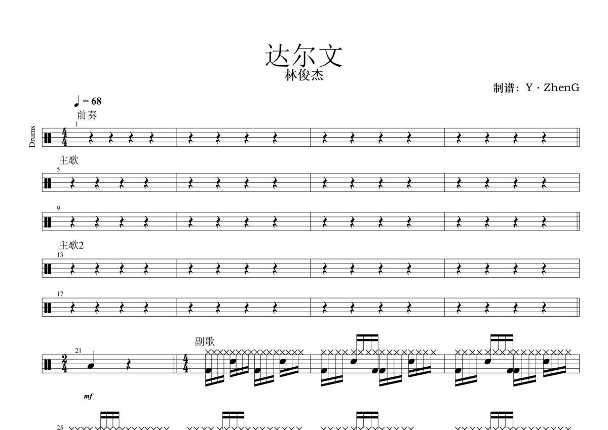 《达尔文》是林俊杰演唱的一首歌曲,拍号为4/4拍,歌曲速度为每分钟68拍,这份鼓谱共有两张高清图谱,图谱由 @Z.H.E.N.G 编配上传,图谱使用五线谱编配,使用这份达尔文架子鼓谱,你将能够轻松地敲打出这首林俊杰的达尔文,快来尝试吧。