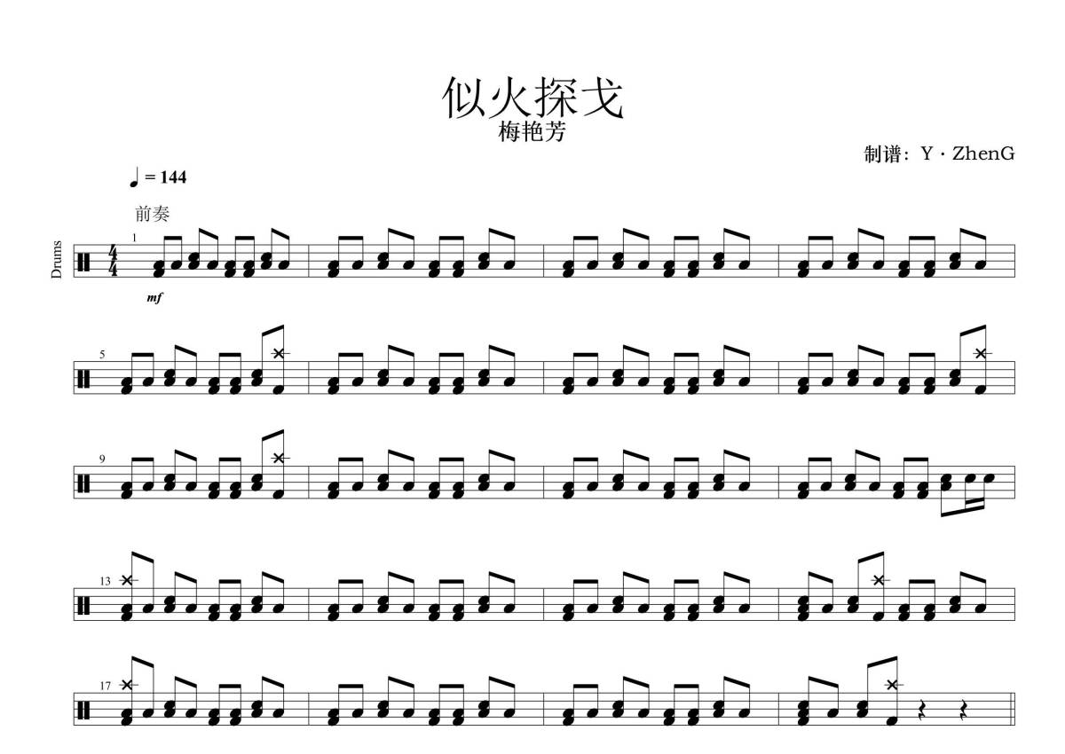 《似火探戈》是梅艳芳演唱的一首歌曲,拍号为4/4拍,歌曲速度为每分钟144拍,这份鼓谱共有四张高清图谱,图谱由 @Z.H.E.N.G 编配上传,图谱使用五线谱编配,使用这份似火探戈架子鼓谱,你将能够轻松地敲打出这首梅艳芳的似火探戈,快来尝试吧。