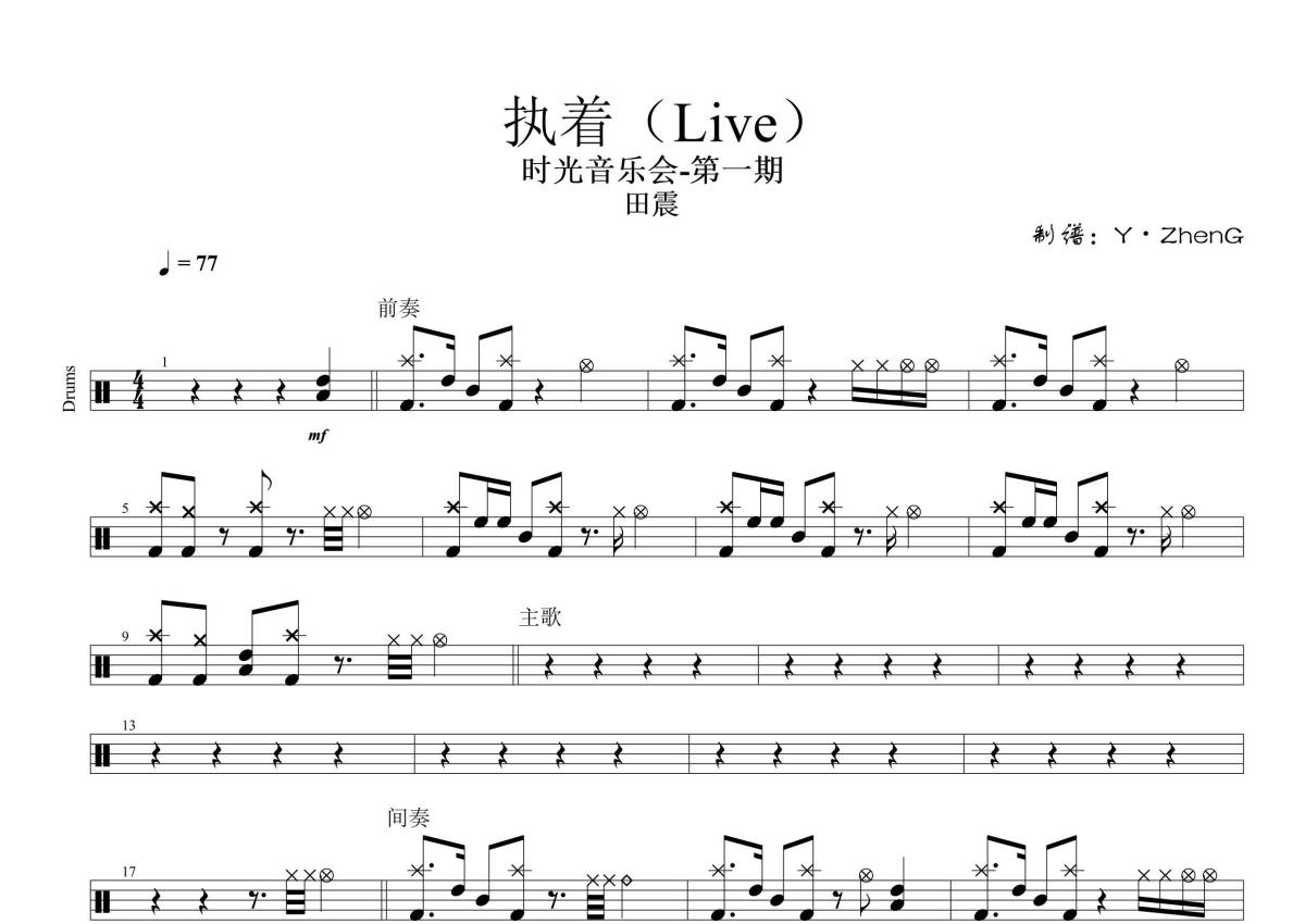 《执着(Live)》是田震演唱的一首歌曲,拍号为4/4拍,歌曲速度为每分钟77拍,这份鼓谱共有两张高清图谱,图谱由 @Z.H.E.N.G 编配上传,图谱使用五线谱编配,使用这份执着(Live)架子鼓谱,你将能够轻松地敲打出这首田震的执着(Live),快来尝试吧。