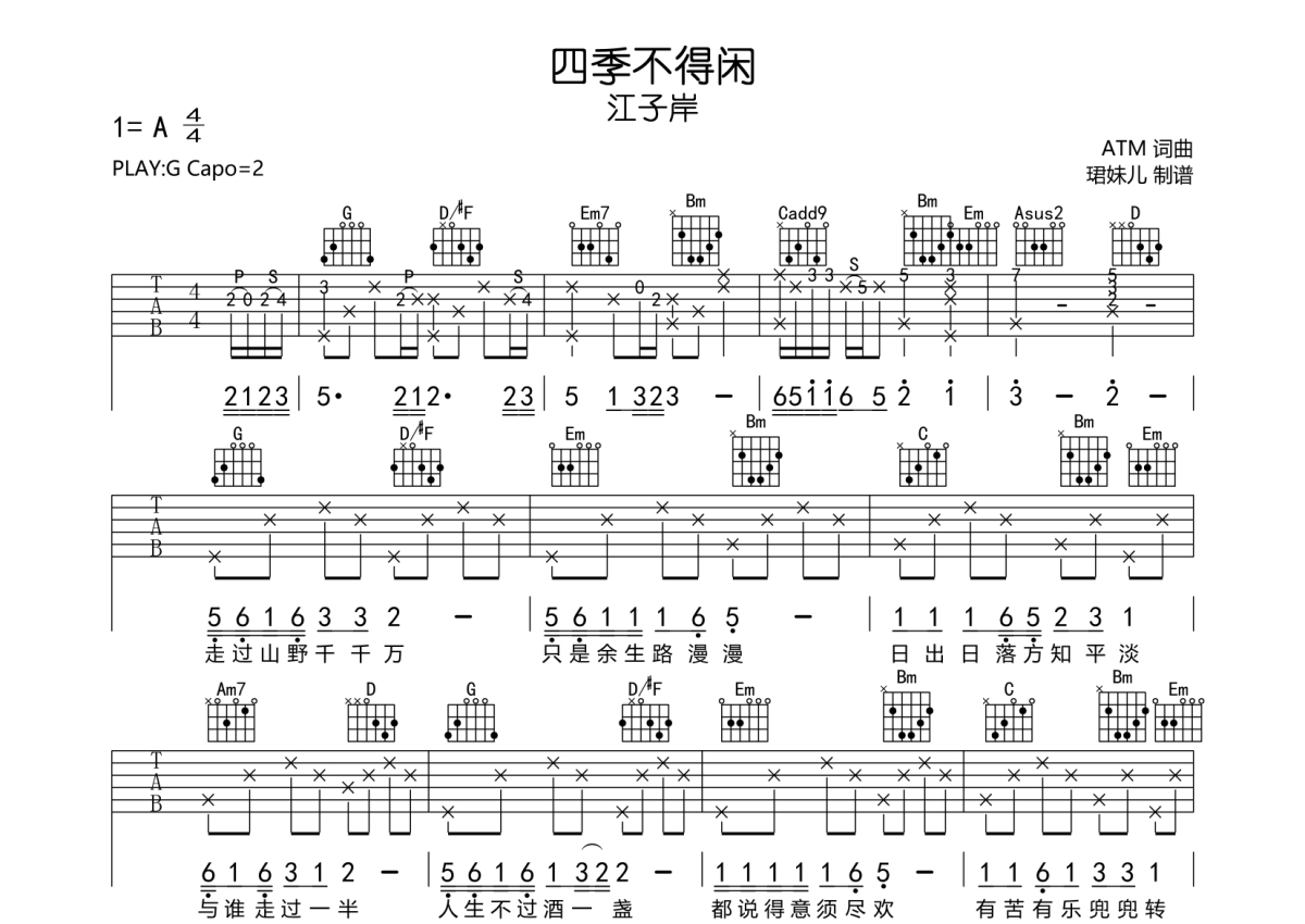 《四季不得闲》是江子岸演唱的一首歌曲,拍号为4/4拍,歌曲速度为每分钟85拍,歌曲原调为A调,但由于原调指法比较难,为了方便弹奏,本吉他谱采用的是G调指法编配,变调夹2品弹奏即为原调,当然也可以根据自己的音域改变变调夹位置,或者通过改变和弦调性,以方便自己弹奏,这份吉他谱共有两张高清图谱,图谱由 @珺妹儿 编配上传,图谱使用六线谱编配,包含吉他和弦指法、简谱以及歌词部分,使用这份四季不得闲吉他谱,可以让你更加方便地掌握这首歌曲的弹唱技巧,快来尝试吧。