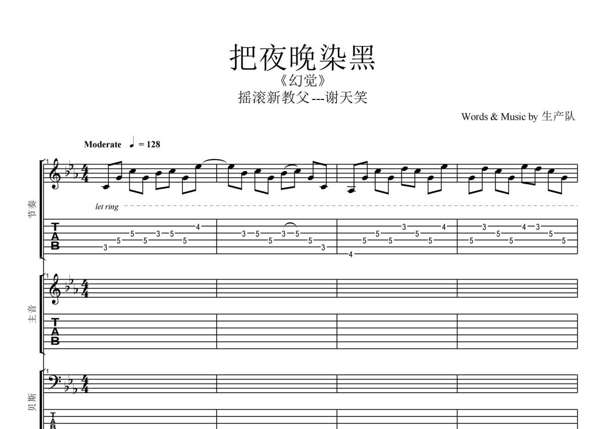 《把夜晚染黑》是谢天笑演唱的一首歌曲,拍号为4/4拍,歌曲速度为每分钟128拍,这份乐队总谱共有一张高清图谱,图谱由 @生产队 编配上传谢天笑演唱的《把夜晚染黑》,本吉他谱为根据原版编配的乐队总谱,包含:吉他(主音),吉他(节奏),贝斯,鼓,主旋律共5轨,乐队总谱效果请听试听。完整版共45页。