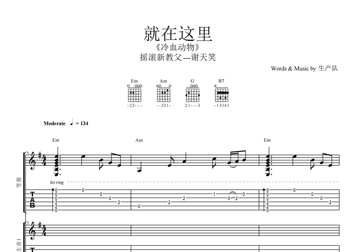 《就在这里》是谢天笑演唱的一首歌曲,拍号为4/4拍,歌曲速度为每分钟134拍,这份乐队总谱共有一张高清图谱,图谱由 @生产队 编配上传谢天笑演唱的《就在这里》,本吉他谱为根据原版编配的乐队总谱,包含:吉他(主音),吉他(节奏),贝斯,鼓,主旋律共,6轨,乐队总谱效果请听试听。完整版48页。