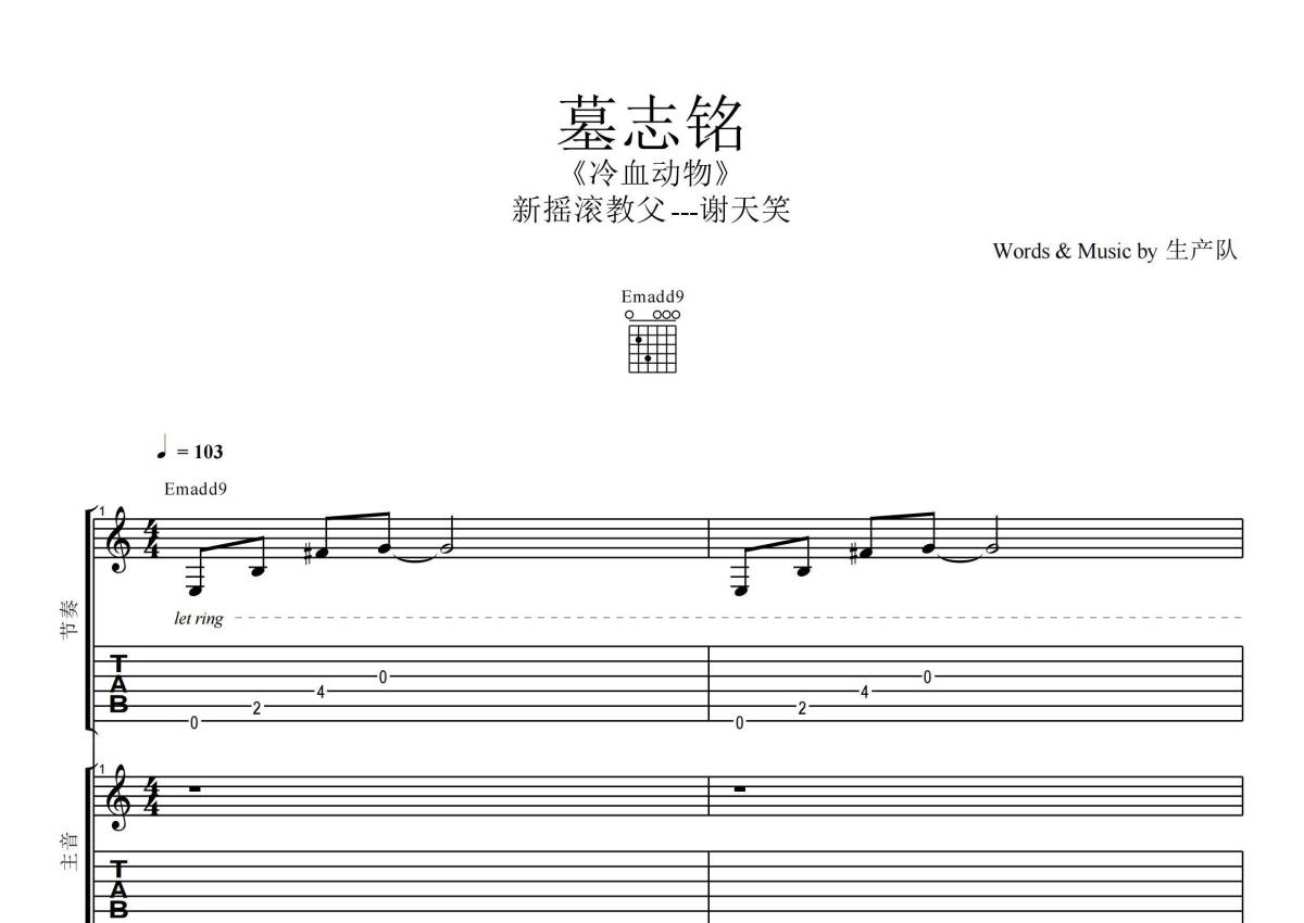 《墓志铭》是谢天笑演唱的一首歌曲,拍号为4/4拍,歌曲速度为每分钟103拍,这份乐队总谱共有一张高清图谱,图谱由 @生产队 编配上传谢天笑演唱的《墓志铭》,本吉他谱为根据原版编配的乐队总谱,包含:吉他(主音),吉他(节奏) ,贝斯,鼓,主旋律共5轨,乐队总谱效果请听试听。完整版曲谱共51页。