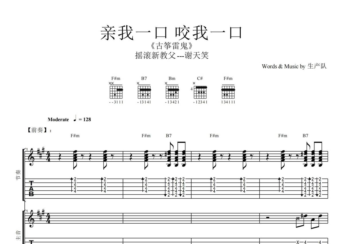 《亲我一口咬我一口》是谢天笑演唱的一首歌曲,拍号为4/4拍,歌曲速度为每分钟128拍,这份乐队总谱共有一张高清图谱,图谱由 @生产队 编配上传谢天笑演唱的《亲我一口咬我一口》,本吉他谱为根据原版编配的乐队总谱,包含:吉他(主音),吉他(节奏) ,效果,贝斯,鼓,主旋律共6轨,乐队总谱效果请听试听。完整版共29页。