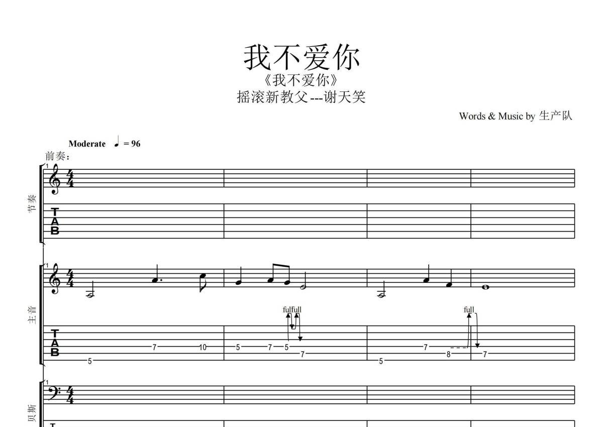 《我不爱你》是谢天笑演唱的一首歌曲,拍号为4/4拍,歌曲速度为每分钟96拍,这份乐队总谱共有一张高清图谱,图谱由 @生产队 编配上传谢天笑演唱的《我不爱你》,本吉他谱为根据原版编配的乐队总谱,包含:吉他(主音),吉他(节奏) ,贝斯,鼓,主旋律共5轨,乐队总谱效果请听试听。完整版共37页。