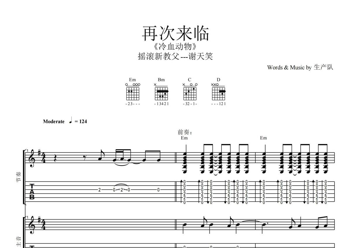 《再次来临》是谢天笑演唱的一首歌曲,拍号为4/4拍,歌曲速度为每分钟124拍,这份乐队总谱共有一张高清图谱,图谱由 @生产队 编配上传谢天笑演唱的《再次来临》,本吉他谱为根据原版编配的乐队总谱,包含:吉他(主音),吉他(节奏) ,金属,贝斯,鼓,主旋律共6轨,乐队总谱效果请听试听。