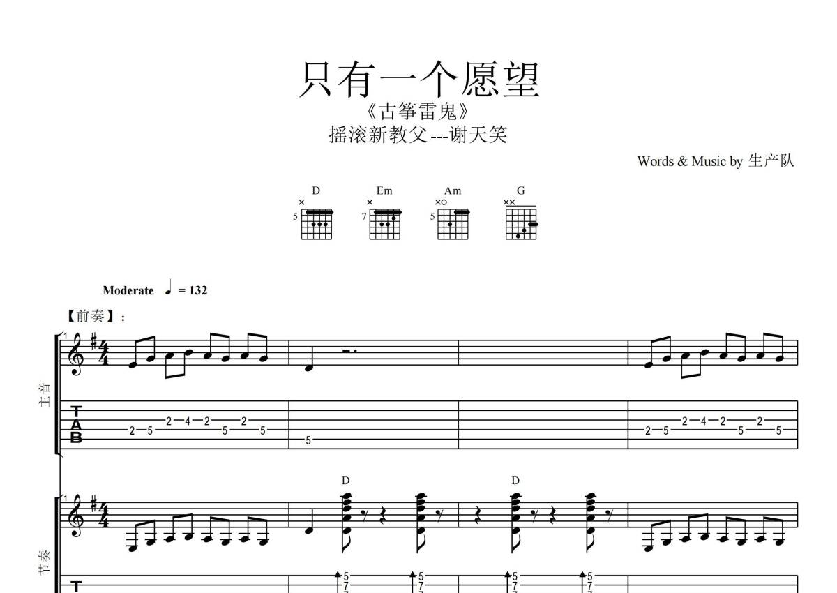 《只有一个愿望》是谢天笑演唱的一首歌曲,拍号为4/4拍,歌曲速度为每分钟132拍,这份乐队总谱共有一张高清图谱,图谱由 @生产队 编配上传谢天笑演唱的《只有一个愿望》,本吉他谱为根据原版编配的乐队总谱,包含:吉他(主音),吉他(节奏) ,贝斯,鼓,主旋律共5轨,完整版共26页,乐队总谱效果请听试听。