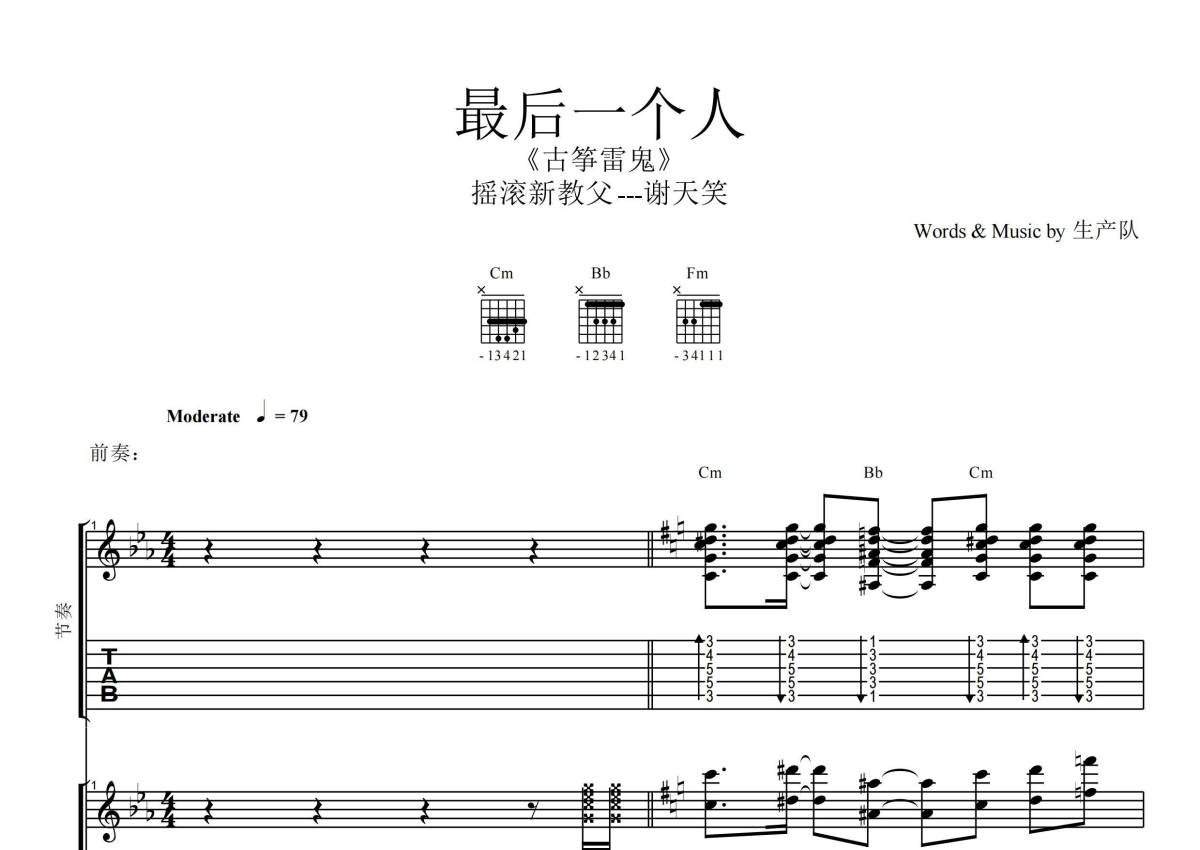 《最后一个人》是谢天笑演唱的一首歌曲,拍号为4/4拍,歌曲速度为每分钟79拍,这份乐队总谱共有一张高清图谱,图谱由 @生产队 编配上传谢天笑演唱的《最后一个人》,本吉他谱为根据原版编配的乐队总谱,包含:吉他(主音),吉他(节奏) ,古筝,贝斯,鼓,主旋律共6轨,完整版共46页,需要下载PDF,乐队总谱效果请听试听。