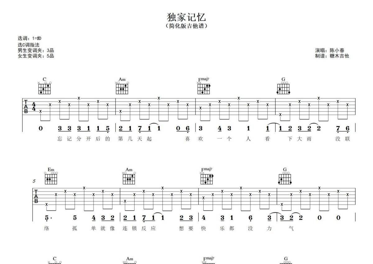 《独家记忆》是陈小春演唱的一首歌曲,分解 扫弦版,拍号为4/4拍,歌曲原调为Eb调,但由于原调指法比较难,为了方便弹奏,本吉他谱采用的是C调指法编配,变调夹3品弹奏即为原调,当然也可以根据自己的音域改变变调夹位置,或者通过改变和弦调性,以方便自己弹奏,这份吉他谱共有三张高清图谱,图谱由 @糖木吉他 编配上传,图谱使用六线谱编配,包含吉他和弦指法、简谱以及歌词部分,使用这份独家记忆吉他谱,可以让你更加方便地掌握这首歌曲的弹唱技巧,快来尝试吧。对新手超友好的简单吉他弹唱谱《独家记忆》 陈小春C调指法版 谱曲对应视频示范以及音频示范都可在抖音搜索(糖木吉他)观看 想要更多吉他谱,可在抖音和小红书搜索关注“糖木吉他” 或者添加老师微信“Tangmu2867 ”来获取更多简单弹唱的吉他谱和弹唱视频。
