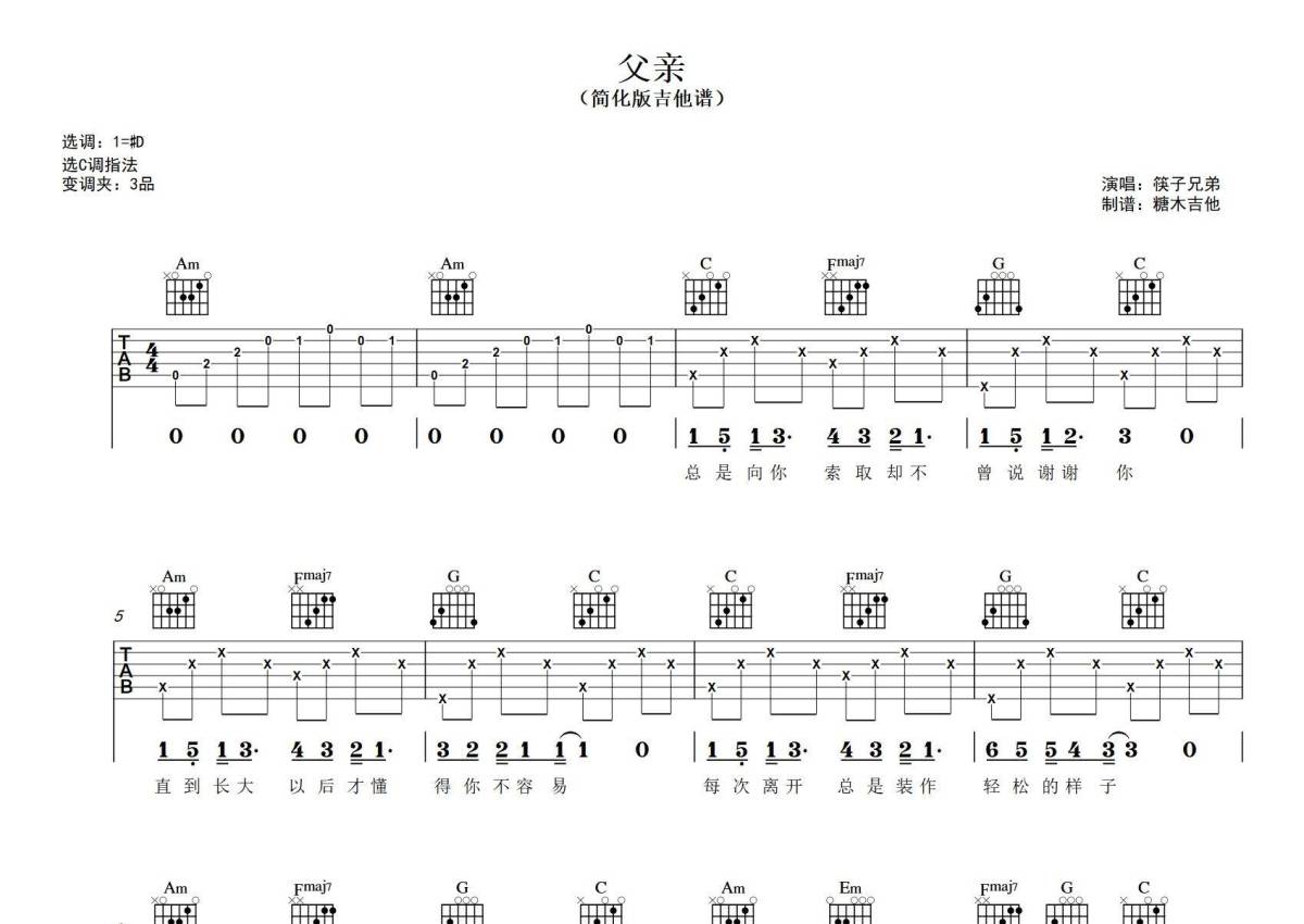 《父亲》是筷子兄弟演唱的一首歌曲,分解 扫弦版,这份吉他谱共有两张高清图谱,图谱由 @糖木吉他 编配上传,图谱使用六线谱编配,包含吉他和弦指法、简谱以及歌词部分,使用这份父亲吉他谱,可以让你更加方便地掌握这首歌曲的弹唱技巧,快来尝试吧。对新手超友好的简化版吉他弹唱谱《父亲》 筷子兄弟C调指法版 谱曲对应视频示范以及音频示范都可在抖音搜索(糖木吉他)观看 想要更多吉他谱,可在抖音和小红书搜索关注“糖木吉他” 或者添加老师微信“Tangmu2867 ”来获取更多简单弹唱的吉他谱和弹唱视频。