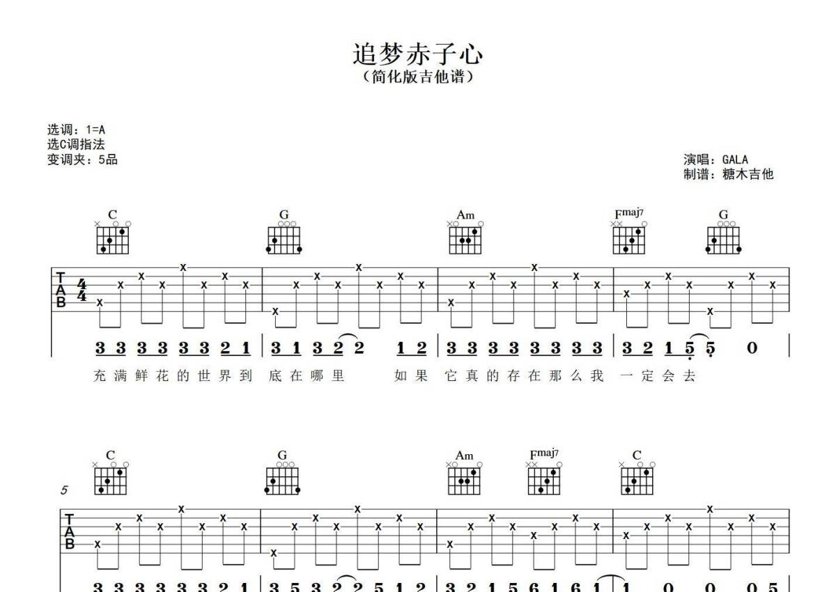 《追梦赤子心》是GALA演唱的一首歌曲,分解 扫弦版,歌曲原调为A调,但由于原调指法比较难,为了方便弹奏,本吉他谱采用的是C调指法编配,变调夹5品弹奏即为原调,当然也可以根据自己的音域改变变调夹位置,或者通过改变和弦调性,以方便自己弹奏,这份吉他谱共有三张高清图谱,图谱由 @糖木吉他 编配上传,图谱使用六线谱编配,包含吉他和弦指法、简谱以及歌词部分,使用这份追梦赤子心吉他谱,可以让你更加方便地掌握这首歌曲的弹唱技巧,快来尝试吧。对新手超友好的简化版吉他弹唱谱《追梦赤子心》 GALA C调指法版 谱曲对应视频示范以及音频示范都可在抖音搜索(糖木吉他)观看 想要更多吉他谱,可在抖音和小红书搜索关注“糖木吉他” 或者添加老师微信“Tangmu2867 ”来获取更多简单弹唱的吉他谱和弹唱视频。