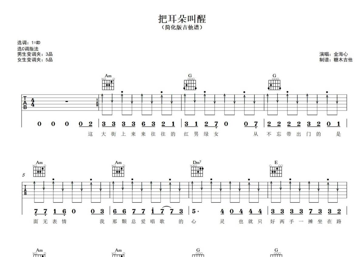 《把耳朵叫醒》是金海心演唱的一首歌曲,拍号为4/4拍,歌曲原调为Eb调,变调夹3品弹奏即为原调,当然也可以根据自己的音域改变变调夹位置,或者通过改变和弦调性,以方便自己弹奏,这份吉他谱共有四张高清图谱,图谱由 @糖木吉他 编配上传,图谱使用六线谱编配,包含吉他和弦指法、简谱以及歌词部分,使用这份把耳朵叫醒吉他谱,可以让你更加方便地掌握这首歌曲的弹唱技巧,快来尝试吧。对新手超友好的简化版吉他弹唱谱《把耳朵叫醒》 金海心C调指法版 谱曲对应视频示范以及音频示范都可在抖音搜索(糖木吉他)观看 想要更多吉他谱,可在抖音和小红书搜索关注“糖木吉他” 或者添加老师微信“Tangmu2867 ”来获取更多简单弹唱的吉他谱和弹唱视频。