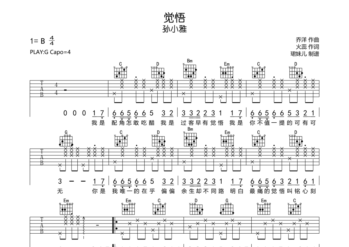 孙小雅《觉悟》吉他谱 - G调弹唱六线谱