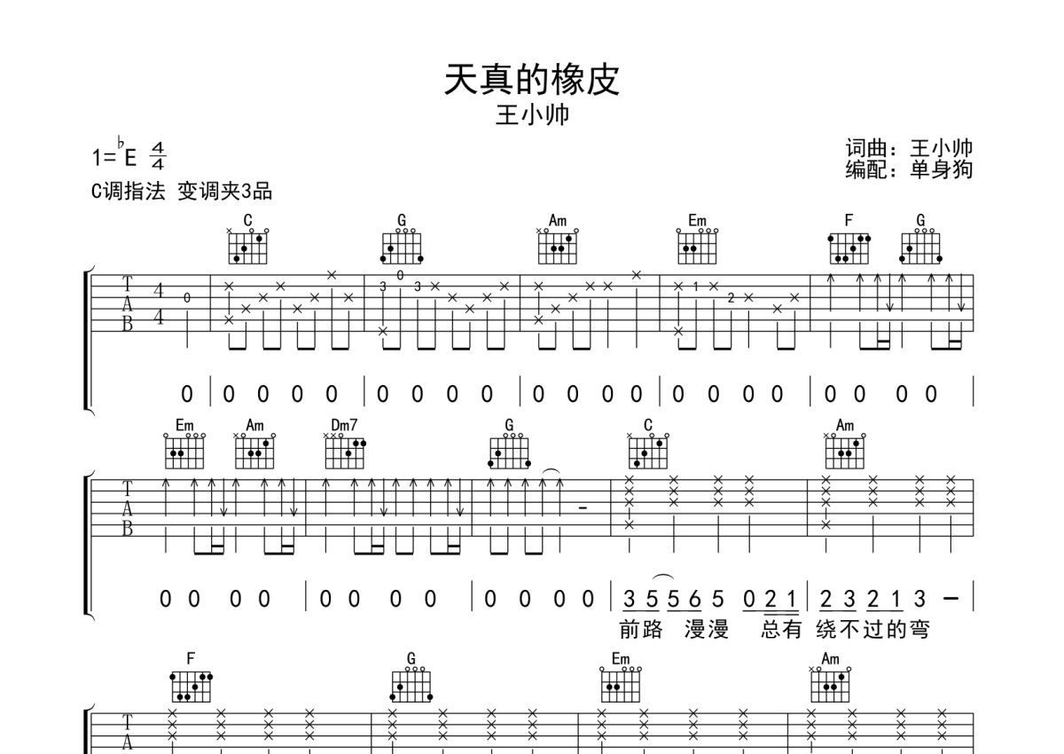 《天真的橡皮》是王小帅演唱的一首歌曲,拍号为4/4拍,歌曲原调为Eb调,但由于原调指法比较难,为了方便弹奏,本吉他谱采用的是C调指法编配,变调夹3品弹奏即为原调,当然也可以根据自己的音域改变变调夹位置,或者通过改变和弦调性,以方便自己弹奏,这份吉他谱共有三张高清图谱,图谱由 @单身狗 编配上传,图谱使用六线谱编配,包含吉他和弦指法、简谱以及歌词部分,使用这份天真的橡皮吉他谱,可以让你更加方便地掌握这首歌曲的弹唱技巧,快来尝试吧。