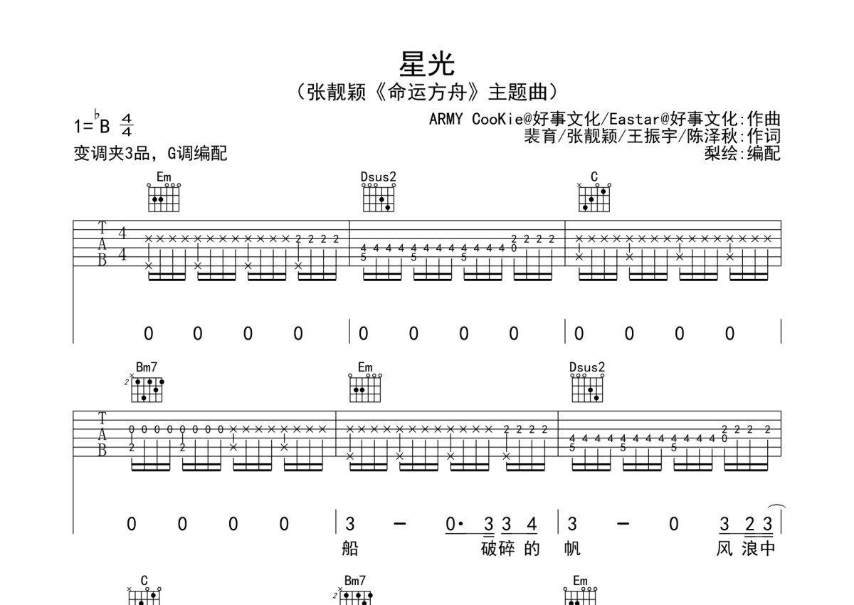 《星光》是张靓颖演唱的一首歌曲,拍号为4/4拍,歌曲速度为每分钟67拍,歌曲原调为Bb调,但由于原调指法比较难,为了方便弹奏,本吉他谱采用的是G调指法编配,变调夹3品弹奏即为原调,当然也可以根据自己的音域改变变调夹位置,或者通过改变和弦调性,以方便自己弹奏,这份吉他谱共有三张高清图谱,图谱由 @l。 编配上传,图谱使用六线谱编配,包含吉他和弦指法、简谱以及歌词部分,使用这份星光吉他谱,可以让你更加方便地掌握这首歌曲的弹唱技巧,快来尝试吧。星光吉他谱,张靓颖演唱,G调编配,变调夹三品。
