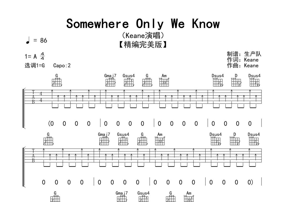 《Somewhere Only We Know》是Keane演唱的一首歌曲,精编完美版,拍号为4/4拍,歌曲速度为每分钟86拍,歌曲原调为A调,但由于原调指法比较难,为了方便弹奏,本吉他谱采用的是G调指法编配,变调夹2品弹奏即为原调,当然也可以根据自己的音域改变变调夹位置,或者通过改变和弦调性,以方便自己弹奏,这份吉他谱共有三张高清图谱,图谱由 @生产队 编配上传,图谱使用六线谱编配,包含吉他和弦指法、简谱以及歌词部分,使用这份Somewhere Only We Know吉他谱,可以让你更加方便地掌握这首歌曲的弹唱技巧,快来尝试吧。《Somewhere Only We Know》是由Keane基音乐团演唱一首歌曲,也是Keane乐队的首支单曲,登上英国金榜TOP 3,成为各大乐评人眼中的“21世纪披头士”。本吉他谱根据原版采用G调指法编配,精编前奏、间奏、尾奏,原版扫弦节奏,非常适合吉他弹唱的欧美金曲,值得推荐!。