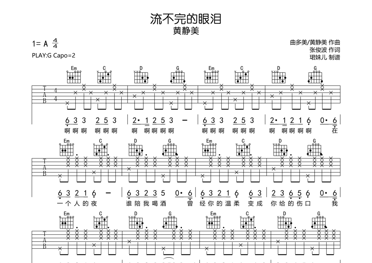 《流不完的眼泪》是黄静美演唱的一首歌曲,拍号为4/4拍,歌曲速度为每分钟85拍,歌曲原调为A调,但由于原调指法比较难,为了方便弹奏,本吉他谱采用的是G调指法编配,变调夹2品弹奏即为原调,当然也可以根据自己的音域改变变调夹位置,或者通过改变和弦调性,以方便自己弹奏,这份吉他谱共有两张高清图谱,图谱由 @珺妹儿 编配上传,图谱使用六线谱编配,包含吉他和弦指法、简谱以及歌词部分,使用这份流不完的眼泪吉他谱,可以让你更加方便地掌握这首歌曲的弹唱技巧,快来尝试吧。