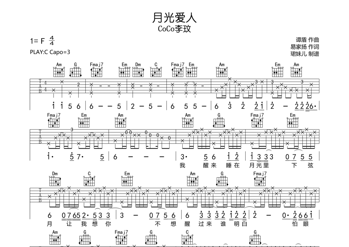 《月光爱人》是李玟演唱的一首歌曲,拍号为4/4拍,歌曲速度为每分钟65拍,歌曲原调为F调,但由于原调指法比较难,为了方便弹奏,本吉他谱采用的是C调指法编配,变调夹3品弹奏即为原调,当然也可以根据自己的音域改变变调夹位置,或者通过改变和弦调性,以方便自己弹奏,这份吉他谱共有两张高清图谱,图谱由 @珺妹儿 编配上传,图谱使用六线谱编配,包含吉他和弦指法、简谱以及歌词部分,使用这份月光爱人吉他谱,可以让你更加方便地掌握这首歌曲的弹唱技巧,快来尝试吧。C调指法编配,弹唱建议变调夹3品,速度65难度较简单,易上手。