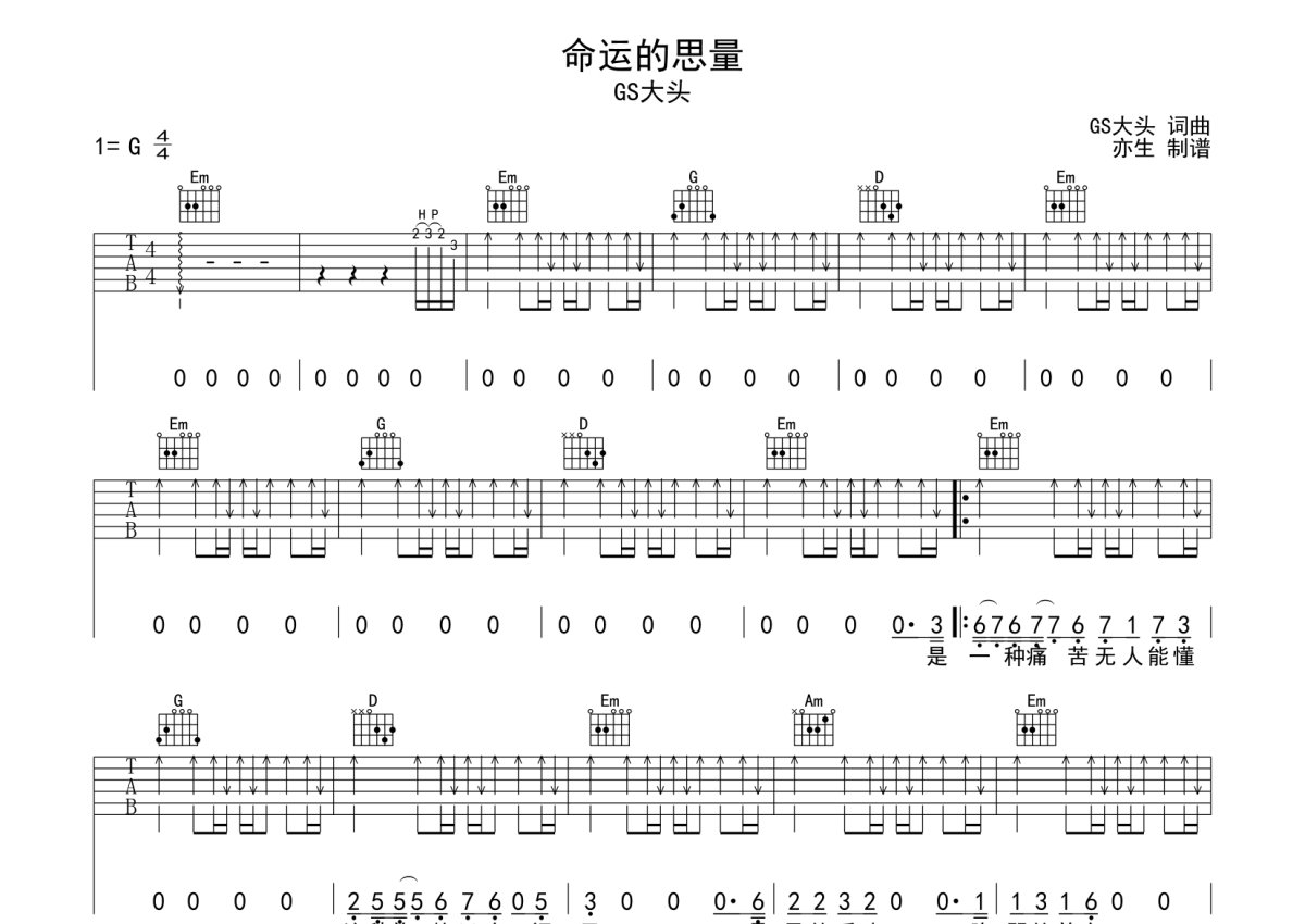 GS大头《命运的思量》吉他谱 - G调弹唱六线谱