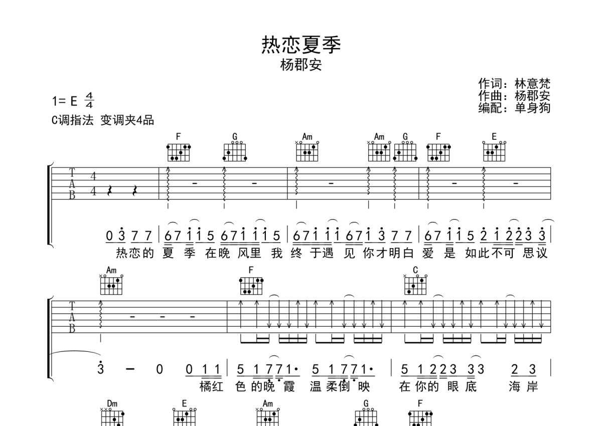 《热恋夏季》是杨郡安演唱的一首歌曲,拍号为4/4拍,歌曲原调为E调,但由于原调指法比较难,为了方便弹奏,本吉他谱采用的是C调指法编配,变调夹4品弹奏即为原调,当然也可以根据自己的音域改变变调夹位置,或者通过改变和弦调性,以方便自己弹奏,这份吉他谱共有三张高清图谱,图谱由 @单身狗 编配上传,图谱使用六线谱编配,包含吉他和弦指法、简谱以及歌词部分,使用这份热恋夏季吉他谱,可以让你更加方便地掌握这首歌曲的弹唱技巧,快来尝试吧。