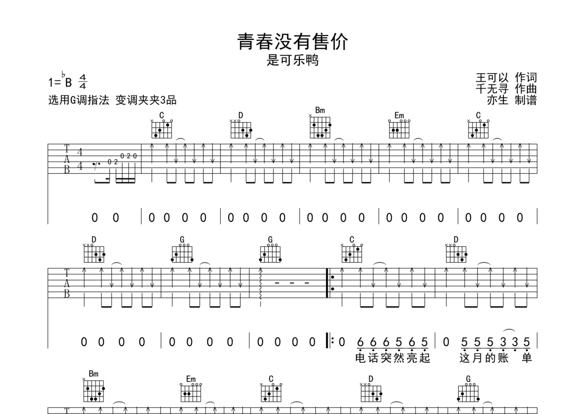 是可乐鸭《青春没有售价》吉他谱 - G调弹唱六线谱