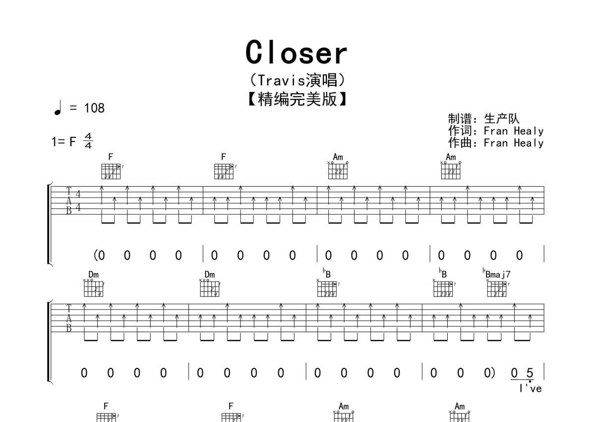 《Closer》是Travis演唱的一首歌曲,精编完美版,拍号为4/4拍,歌曲速度为每分钟108拍,歌曲原调为F调,但由于原调指法比较难,为了方便弹奏,本吉他谱采用的是F调指法编配,演奏时不需要使用变调夹即为原调,这份吉他谱共有三张高清图谱,图谱由 @生产队 编配上传,图谱使用六线谱编配,包含吉他和弦指法、简谱以及歌词部分,使用这份Closer吉他谱,可以让你更加方便地掌握这首歌曲的弹唱技巧,快来尝试吧。《Closer》是英国崔维斯(Travis)乐队演唱的经典歌曲,出自专辑《 The Boy With No Name》,发行时间为2007年5月7日。本吉他谱根据原版F调指法编配,精准的前奏、间奏、尾奏,原版扫弦节奏编配,非常温暖的一首歌曲,值得推荐的欧美金曲!。