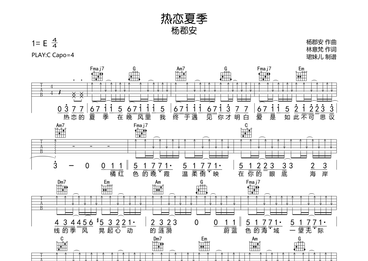 杨郡安《热恋夏季》吉他谱 - C调弹唱六线谱