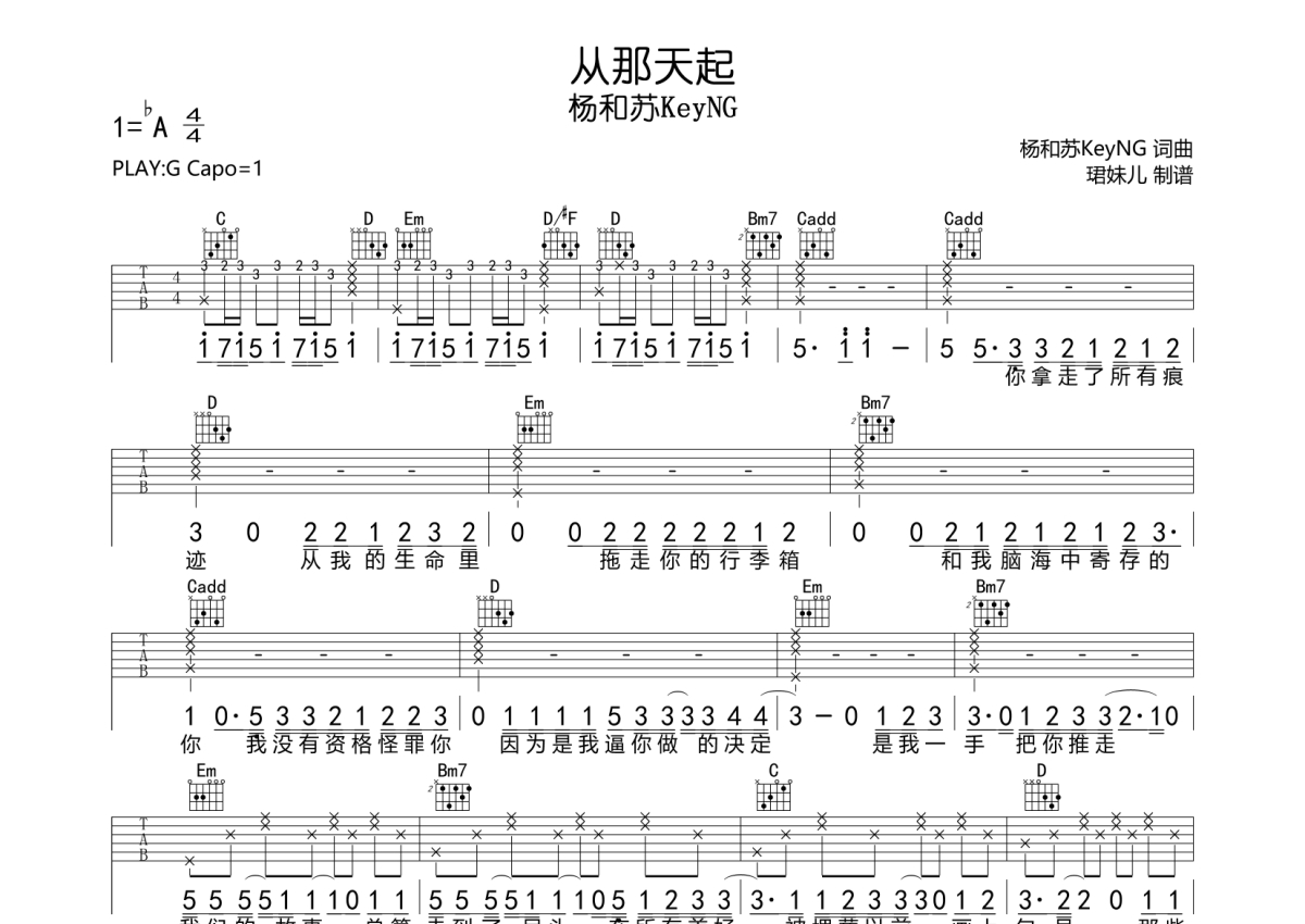 《从那天起》是杨和苏KeyNG演唱的一首歌曲,拍号为4/4拍,歌曲速度为每分钟83拍,歌曲原调为Ab调,但由于原调指法比较难,为了方便弹奏,本吉他谱采用的是G调指法编配,变调夹1品弹奏即为原调,当然也可以根据自己的音域改变变调夹位置,或者通过改变和弦调性,以方便自己弹奏,这份吉他谱共有两张高清图谱,图谱由 @珺妹儿 编配上传,图谱使用六线谱编配,包含吉他和弦指法、简谱以及歌词部分,使用这份从那天起吉他谱,可以让你更加方便地掌握这首歌曲的弹唱技巧,快来尝试吧。